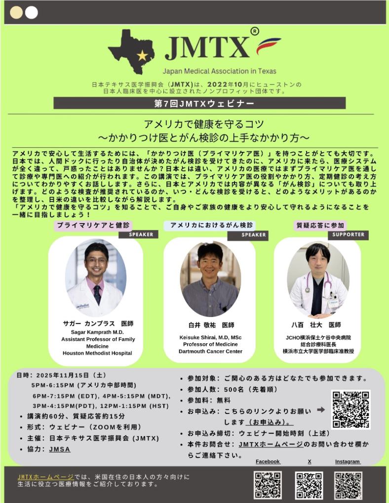 日本テキサス医学振興会(JMTX :Japan Medical Association in Texas) 主催の無料ウェビナーをご案内いたします。